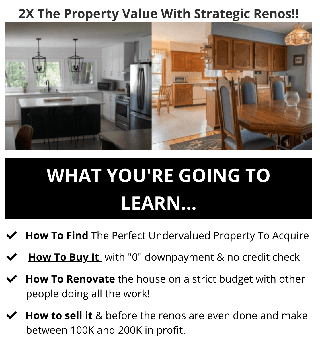 • How to sell it & before the renos are even done and make between 100K and 200K in profit.